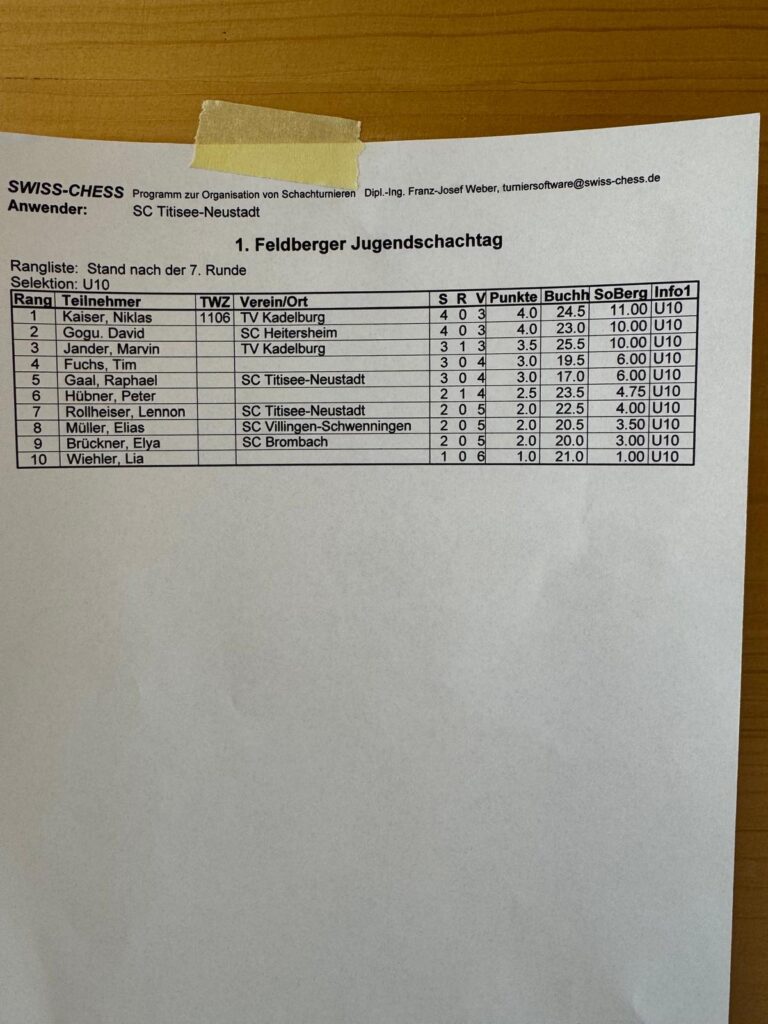 In der U14 schaffte es Elias Franz sogar auf Platz 2, wo er schon gewisse Chancen auf einen Freiplatz in der Badischen hat. Gewonnen in der U14 hat Niklas Oktai vom SC Brombach. Claudius konnte auch einen Sieg gegen einen DWZ gewerteten Gegner feiern.